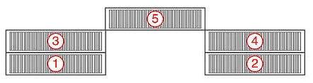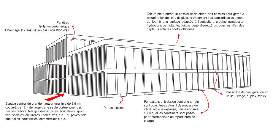 Structure constituée de 5 containers disposés en forme d’arche, juxtaposables au gré de l’utilisateur.